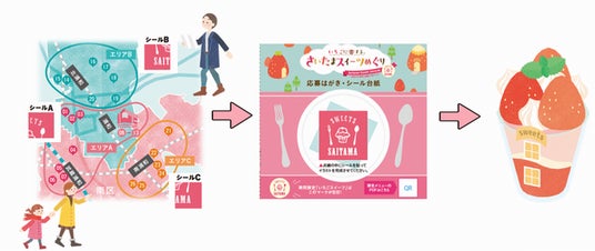 参加店舗をAからCの3つのエリアに分類。各エリアの参加店舗をめぐってシールを集めていただくと、各店舗がセレクトしたさいたまスイーツが当たる抽選に応募できます。