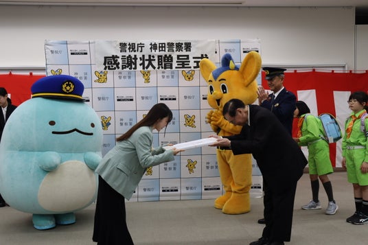 サンエックス株式会社(本社:東京都千代田区)は、お茶の水小学校および千代田小学校に入学する新一年生へ寄贈するランドセルカバーのデザイン(すみっコぐらし)提供を通じ、交通安全に多大な貢献をすることが評価され、2025年12月17日(水)、神田警察署長より感謝状を贈呈されました。