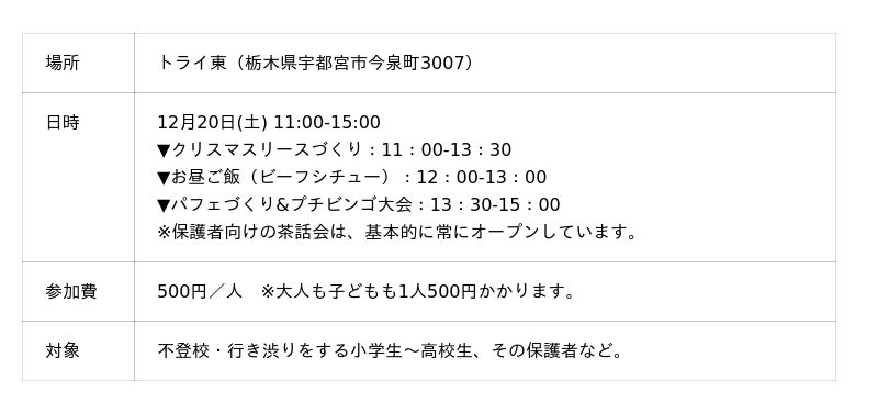 栃木県宇都宮市に拠点をおくNPO法人キーデザインは、宇都宮市まちづくりセンター、宇都宮市青少年活動センターと協働で、12月20日(土)に「学校の外の文化祭ミニ(クリスマスver)」を開催します。