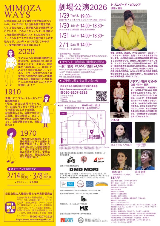 本作は、「日仏女性の人権架け橋ミモザ実行委員会」と、フランスで10年のロングランを続ける女性の権利をテーマにした演劇の作家、トリニダード・ガルシアの協働で作られた、オリジナル作品です。日本の女性たちに4年にわたるインタビューと調査を行い、フランス語で執筆され、日本語に翻訳されました。さまざまな過去の映像や音楽、そしてフランスらしいユーモアが随所に散りばめられていて、楽しさいっぱい。女性団体や研究者の監修を受けて真摯に作られた珠玉の作品です。