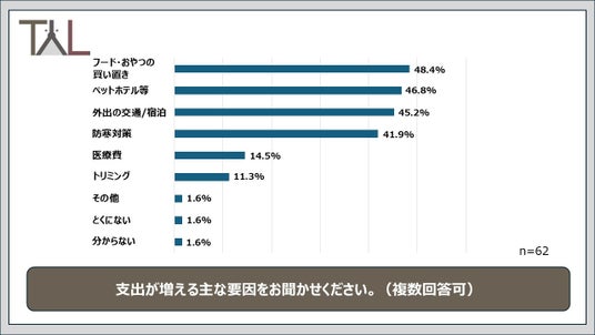 また、「支出が増える」と回答した62名に理由を尋ねたところ、「フード・おやつの買い置き(48.4%)」「ペットホテル等(46.8%)」「外出の交通/宿泊(45.2%)」「防寒対策(41.9%)」が主な要因として挙げられました。全体として、年末年始はペットとの過ごし方に大きな変化はないものの、旅行・帰省時の対応やサービス料金が、飼い主にとって悩みの種となっている様子がうかがえます。