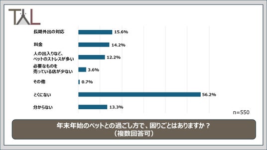 続いて「年末年始のペットとの過ごし方で、困りごとはありますか?」と質問したところ、こちらも「とくにない」が56.2%と最多に。さらに「年末年始でペット関連の支出は増えますか?」という質問でも「変わらない」が52.7%を占めました。一方で、困りごとの具体的な声としては「長期外出の対応(15.6%)」「料金(14.2%)」「人の出入りによるペットのストレス(12.2%)」が上位に挙がりました。