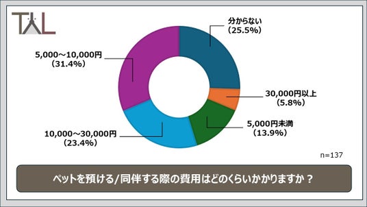 年末年始に遠方へ外出すると回答した137名の飼い主に「預ける/同伴する際の費用はどのくらいかかりますか?」と質問したところ、もっとも多かったのは「5,000~10,000円(31.4%)」でした。「5,000円未満(13.9%)」と合わせると、約45%の飼い主が比較的低予算で預け先を確保していることが分かります。