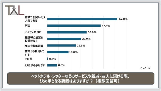 さらに「ペットを預ける際の決め手となる要因はなんですか?」と質問したところ、最多は「信頼できるサービス/人物であること(62.0%)」。次いで「料金(47.4%)」が続き、費用を抑えつつも安心できる預け先を求める飼い主心理が浮き彫りになりました。また、飼い主550名に「年末年始に『もっとあったらいい』と思うサービスはありますか?」と質問したところ、半数以上が「とくに変わらない」と回答した一方で、「ペット同伴の旅行プラン(16.4%)」「ペットホテルの充実(14.9%)」「ペットシッターの充実(10.4%)」など、外出時に利用するサービスへの期待が一定数寄せられたほか、「ペットと一緒に入れるレストランの充実(男性・60代前半)」といった具体的な要望も見られました。