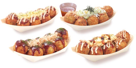 左上:チーズ明太子、 右上:ねぎだこ、 左下:創業以来人気No.1 「ぜったいうまい!! たこ焼」、 右下:てりたま