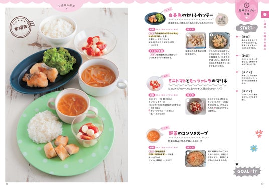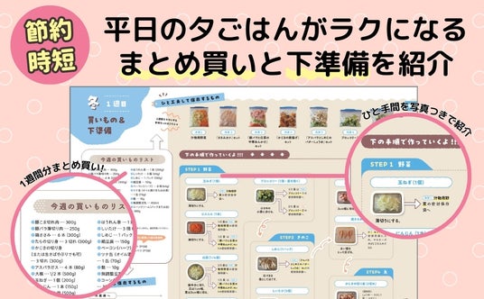 さらに、平日5日間のレシピを一気に準備できる、週に1回の「まとめ買い」と「下準備」のコツを掲載。レシピの考案から買い物、下ごしらえ、調理までの手間を、1週間分まとめて解決します。著者がこれまで実践してきた「フリージング」などの効率的な調理テクニックを取り入れ、手順ごとに写真つきで解説しています。下準備をしておけば、当日の調理は簡単。忙しい平日の夕食をサポートします。