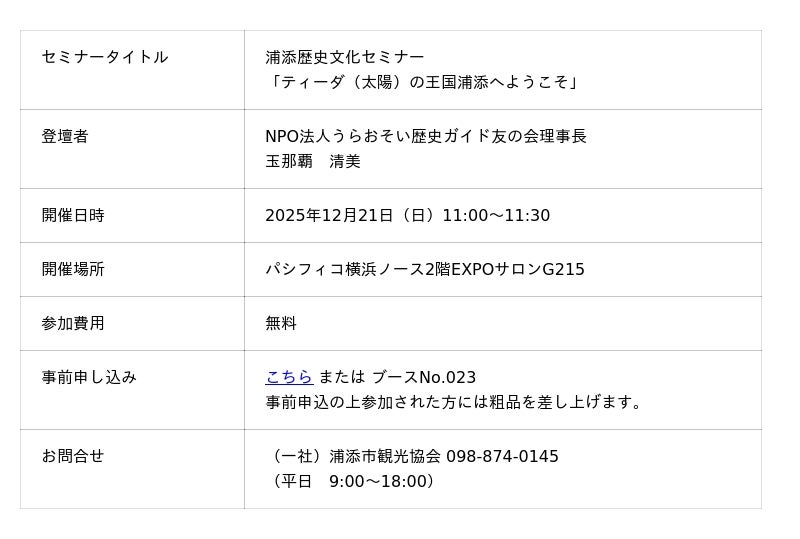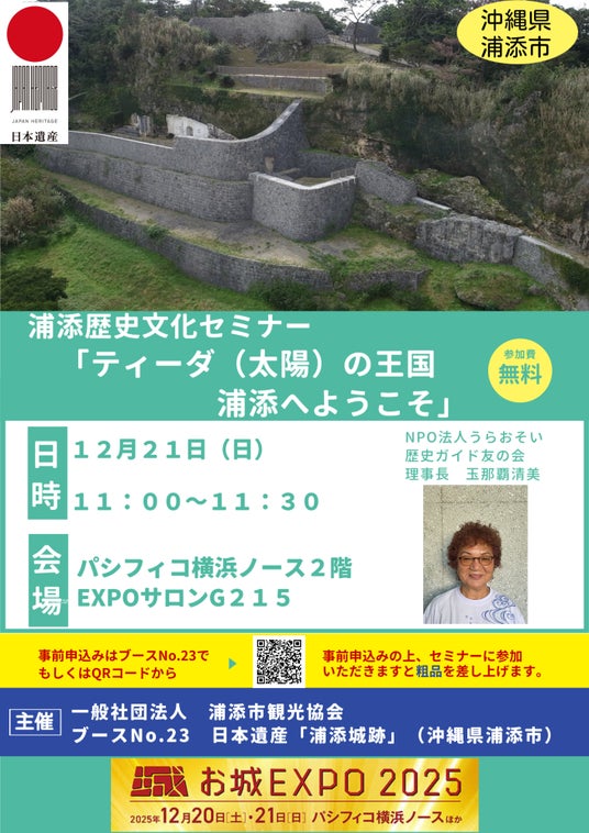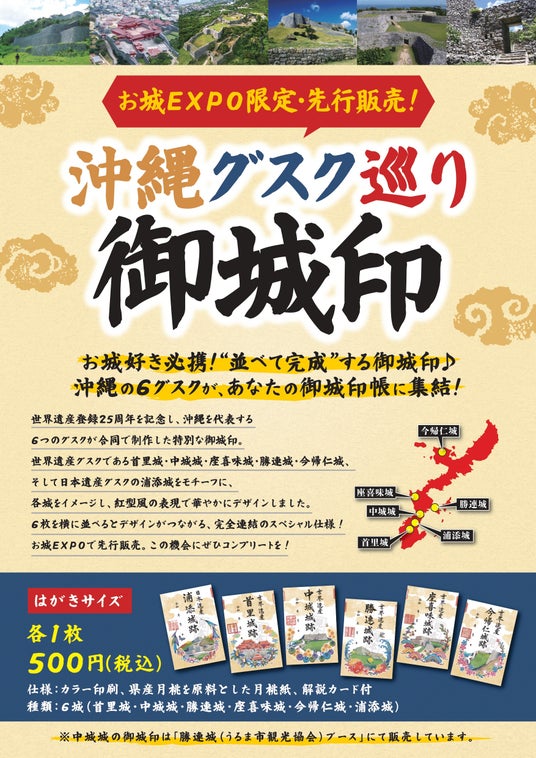 一般社団法人 浦添市観光協会(沖縄県浦添市)は、2025年12月20日(土)、21日(日)にパシフィコ横浜ノースで開催される「お城EXPO2025」に、日本遺産「浦添城跡」として4年連続で出展いたします 。会場では、沖縄の世界遺産登録25周年 を記念し、首里城・中城城など6つのグスクが合同で制作した「沖縄グスク巡り御城印」を一般販売(12月24日)に先駆け先行販売します。6枚を横に並べるとデザインがつながる完全連結のスペシャル仕様 で、相互誘客の促進 を目指します。また、歴史セミナー「ティーダ(太陽)の王国浦添へようこそ」 も開催します。