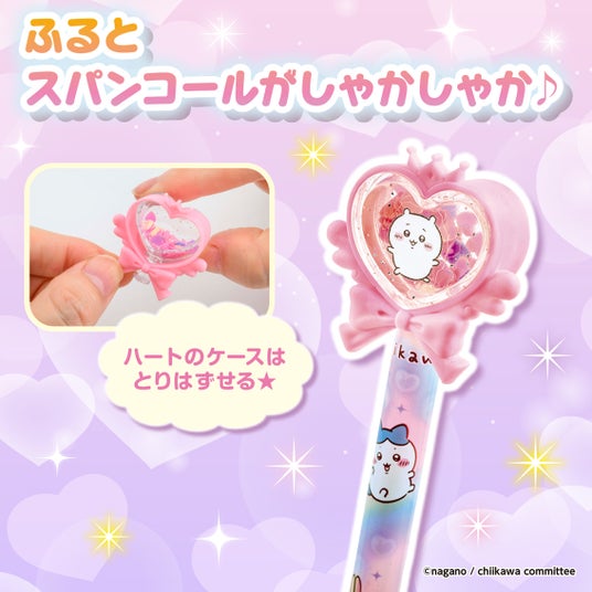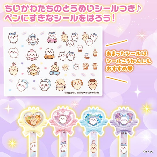 ペンは、上部にスパンコール入りのハートケースがついていて、ふると“しゃかしゃか”音が鳴るのが楽しい! シールはハートケースに貼ったり、シール交換したり、使い方いろいろ。
