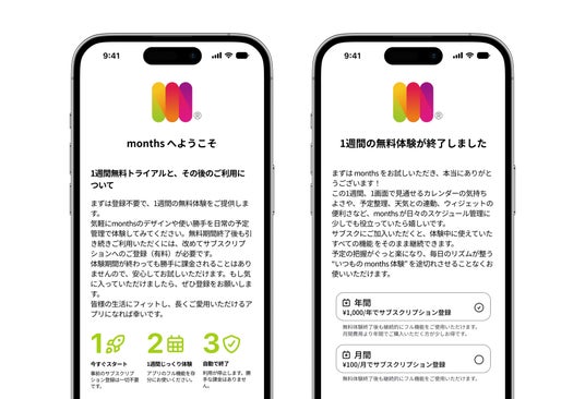 新しいカレンダーアプリへの乗り換えには勇気がいります。「months」では、そのハードルを極限まで下げるため、1週間の無料お試し期間を用意しました。最大の特徴は、「サブスクリプションへの事前登録が不要」であること。