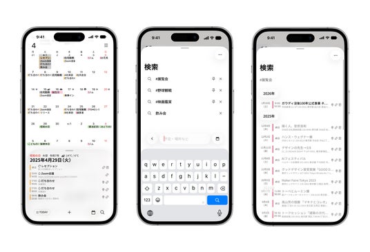 予定の確認だけでなく、検索機能も強力です。頻繁に検索するキーワード(例:「#展覧会」「#会議」)を検索画面に「ピン留め」する機能を搭載。