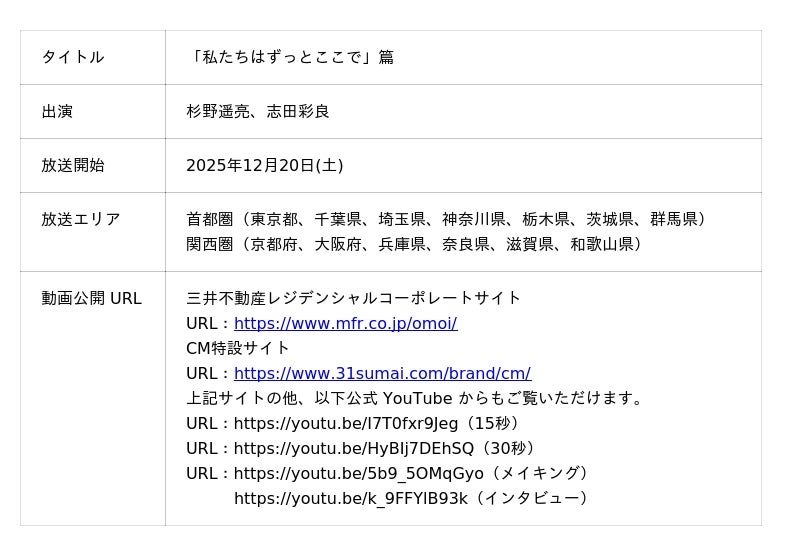 三井不動産レジデンシャル株式会社(本社:東京都中央区、代表取締役社長:嘉村 徹)は、俳優の杉野遥亮さんと志田彩良さんが出演する新TVCM「私たちはずっとここで」篇を2025年12月20日(土)より関東と関西で放映開始いたします。