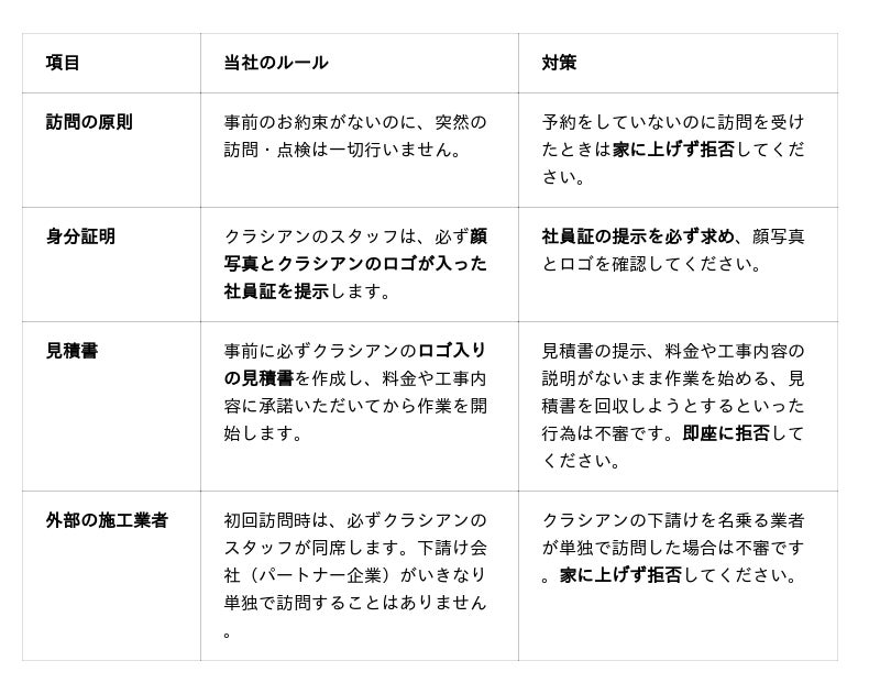 1. 社員証の確認徹底訪問者がクラシアンのスタッフであるかを確認するため、「クラシアンの社員証を見せてほしい」と必ず伝えてください。不審な点があれば、その場での契約や作業を拒否してください。
