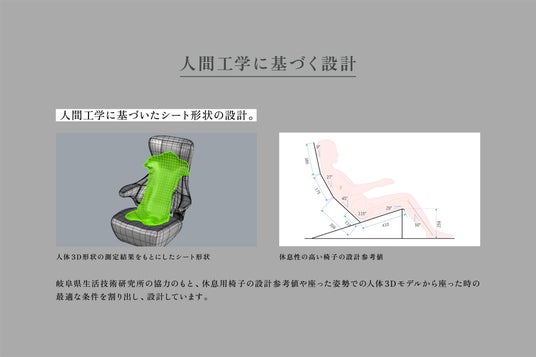 公的な研究所の協力のもと、人体3Dモデルから座った時の最適な条件を割り出し、設計しています。体への負担を軽減する体圧分散を実現しています。