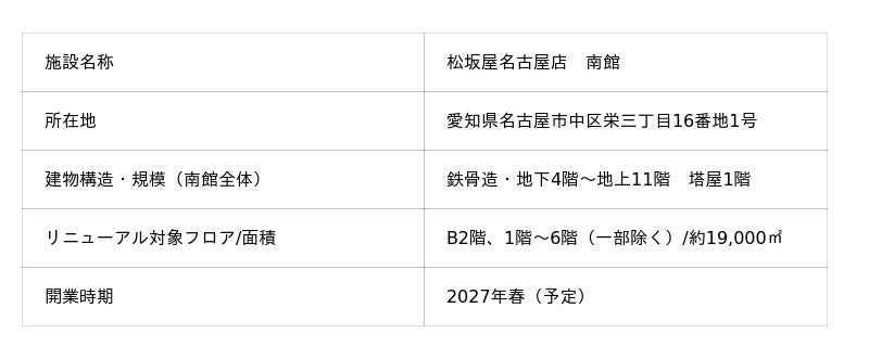 J.フロント リテイリンググループの大丸松坂屋百貨店とパルコは、松坂屋名古屋店南館の一部(B2階および1階~6階 ※一部除く)を、パルコが運営する新しい商業施設へと大規模リニューアルします。本計画は、百貨店とパルコの強みを融合することにより、さらに幅広いお客様を呼び込む商業施設への転換を目指すもので、グループの重点エリアである名古屋・栄エリアの魅力向上にも貢献します。当該フロアは2026年2月以降順次工事に入り、2027年春の開業を予定しています。