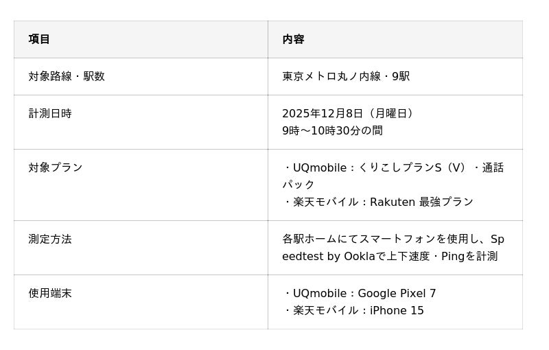 UQmobileはGoogle Pixel 7、楽天モバイルはiPhone 15を使用しました。測定アプリは両端末とも「Speedtest by Ookla」を使用し、各駅ホームにて下り速度・上り速度・Pingを計測しています。