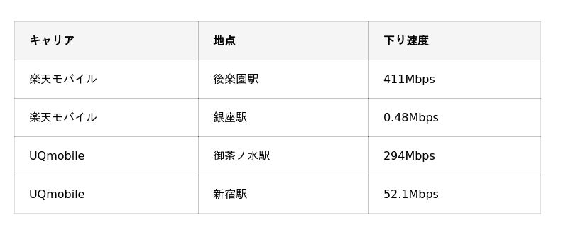 楽天モバイルは後楽園駅(高架駅)で411Mbpsを記録した一方、銀座駅(複雑構造+混雑)で0.48Mbpsと約856倍の速度差が発生しました。