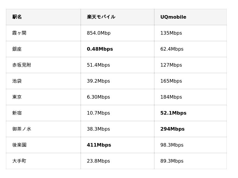 A:駅ごとに最適なSIMが異なるため一概には言えません。 例えば後楽園駅では楽天モバイルが最速(411Mbps)でしたが、御茶ノ水駅や東京駅ではUQmobileの方が高速で、駅環境によって有利なSIMが変わります。