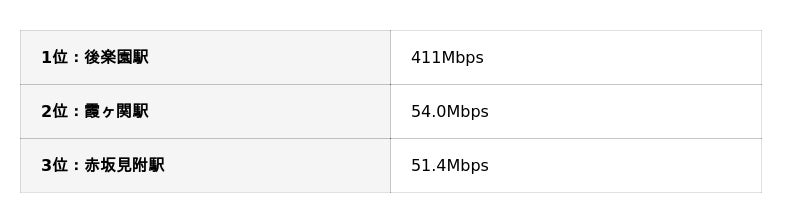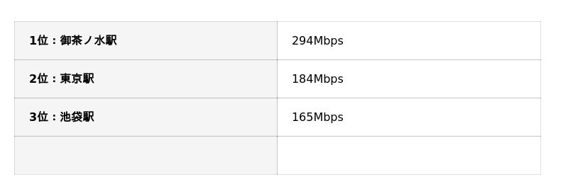 2位以下との差は約7.6倍と非常に大きく、最低速の銀座駅(0.48Mbps)とは約856倍もの差がありました。