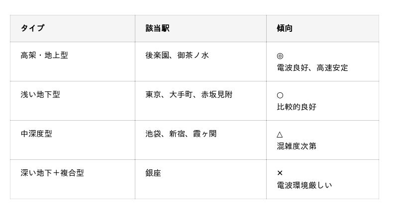 後楽園駅が最速だったのは丸ノ内線で唯一の高架駅(地上2F)で電波が届きやすいため。銀座駅が最低速だったのは3路線交差の複雑構造+古い駅舎+高混雑度が原因です。