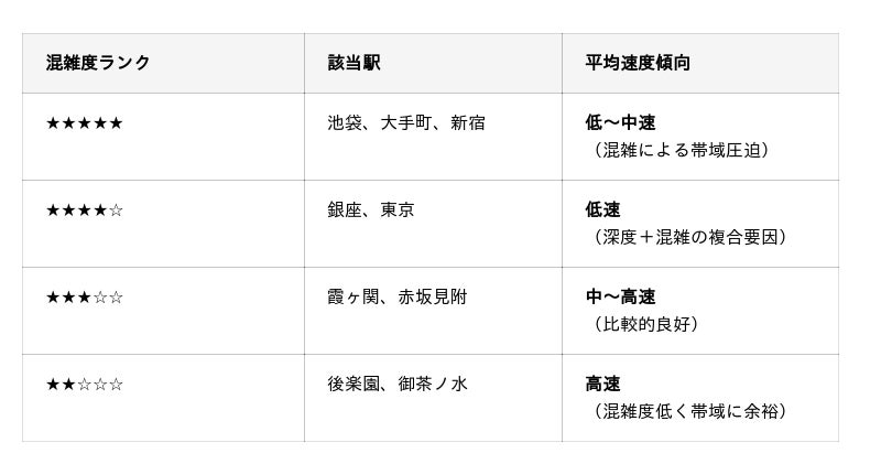 利用者が多い駅では帯域が分散し、一人当たりの速度が低下。池袋駅は東京メトロ全130駅中1位(1日平均518,135人)、大手町駅は2位(334,541人)と極めて混雑度が高く、ピーク時間帯は速度低下が顕著になります。