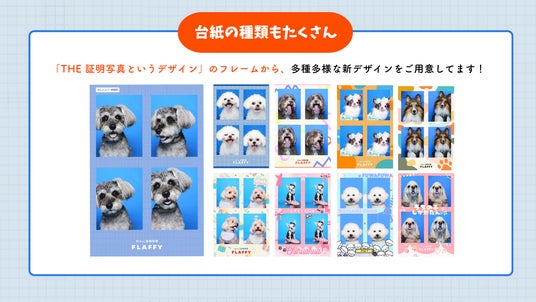 フレームの種類は約70種類以上に増加し、選ぶ楽しみがさらに広がりました。また新機能として「ステッカー装飾機能」が追加され、撮影した写真にスタンプを自由に加えて、世界に一つだけのオリジナル証明写真を作成いただけます。定番人気のTHE証明写真風「わんナンバー」フレームをはじめ、うちの子推し活フレームやうちの子バースデーフレーム、犬種別や季節限定デザインなど盛りだくさん。毎回、選ぶ楽しみも増えました!さらに従来のフルサイズ以外にハーフサイズなども加わり、より多彩な仕上がりをお楽しみいただけます。愛犬との大切な思い出を、もっと自由に、もっと楽しく残してみてはいかがでしょうか。
