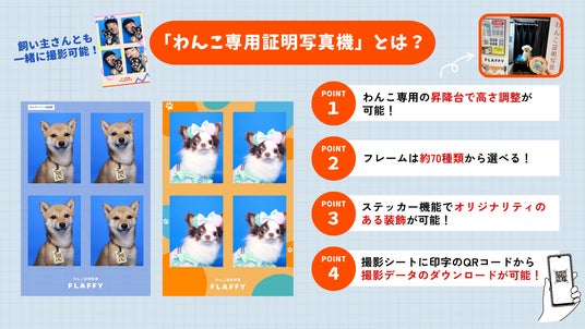 「わんこ専用証明写真機」は、FLAFFYが独自で企画・展開するわんこ専用のセルフ撮影機です。人間用の証明写真機と同じ操作感で、愛犬の“今”を楽しく、高クオリティで気軽に撮影できます。約70種類以上から選べるフレームや、オリジナリティある装飾が可能なステッカー機能、QRコードによる撮影データのダウンロードなど、思い出づくりをサポートする工夫が詰まった新しい体験型コンテンツです。
