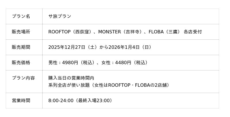 居場所事業、エンターテイメント事業を展開する株式会社メッセプロパティー(本社:東京都港区、代表取締役:宮本 茂)が運営する中央線沿線のサウナ・スパ・コワーク施設、ROOFTOP(西荻窪)、MONSTER WORK&SAUNA(吉祥寺)、FLOBA(三鷹)は、2025年12月27日(土)から2026年1月4日(日)まで、系列全店使い放題となるお得なパッケージプラン「サ旅プラン」を販売します。