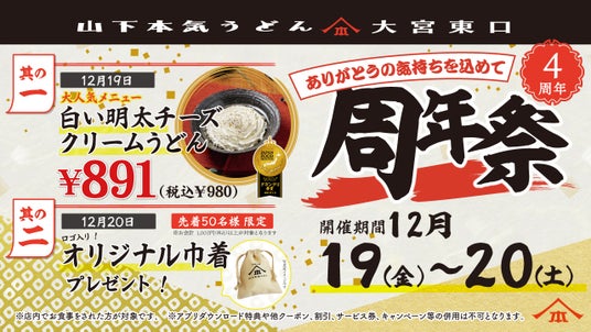 株式会社ガーデン(本社:東京都新宿区 代表取締役社長:川島賢 以下「当社」) が運営する、「山下本気うどん大宮東口」は、2025年12月20日(土)にオープン4周年を迎えます。ご愛顧くださるお客様への感謝の気持ちを込めて、「山下本気うどん 大宮東口」にご来店いただいたお客様を対象とした「周年祭」を2025年12月19日(金)・20日(土)の2日間限定で開催いたします。
