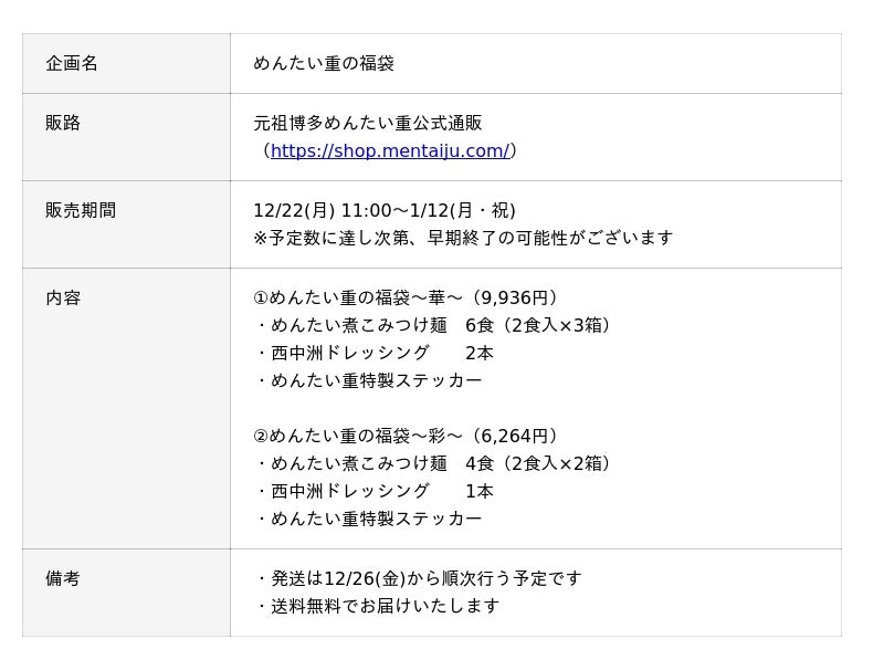 元祖博多めんたい重株式会社は、2025年12月22日(月)より、公式通販にて初の福袋を期間限定で販売いたします。