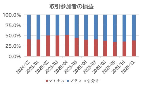 10月のFX取引において実現益を出した投資家の割合は61.2%と、10月の63.9%から2.7%ポイント減少した。直近4カ月は、6割超の投資家が利益を積み上げているが、徐々に頭打ち傾向もみられる。
