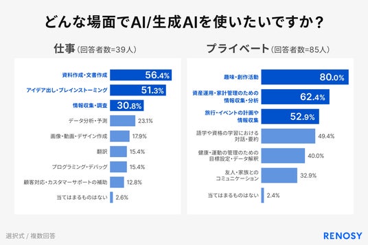 さらに、AI/生成AIを活用したい場面を尋ねたところ、仕事においては「資料作成・文章作成」、「アイデア出し・ブレインストーミング」が多い回答でした。プライベートにおいては、多い回答は「趣味・創作活動」、「資産運用・家計管理のための情報収集・分析」という結果になりました。