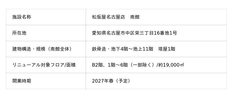 J.フロント リテイリンググループの大丸松坂屋百貨店とパルコは、松坂屋名古屋店南館の一部(B2階および1階~6階 ※一部除く)を、パルコが運営する新しい商業施設へと大規模リニューアルします 。 本計画は、百貨店とパルコの強みを融合することにより、さらに幅広いお客様を呼び込む商業施設への転換を目指すもので、グループの重点エリアである名古屋・栄エリアの魅力向上にも貢献します。当該フロアは2026年2月以降順次工事に入り、2027年春の開業を予定しています。