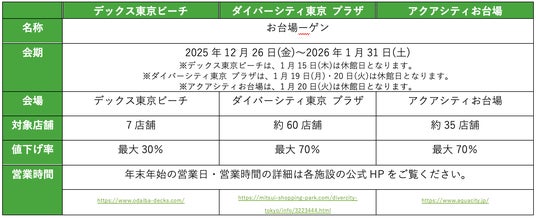 デックス東京ビーチ(運営:東急不動産SCマネジメント株式会社)、ダイバーシティ東京 プラザ(運営:三井不動産商業マネジメント株式会社)、アクアシティお台場(運営:三菱地所プロパティマネジメント株式会社)の大型商業施設3施設では、お台場エリアを盛り上げるべく、この冬から「ODAIBA FUN ISLAND(お台場ファンアイランド)」を始動。3施設それぞれ、お買い上げレシートでプレゼントが当たるキャンペーンや、人気キャラクターとコラボレーションした体験型イベントのほか、2025年12月26日(金)から2026年1月31日(土)までの期間限定で、毎年恒例となった合同バーゲン「お台場ーゲン」を同時開催します。
