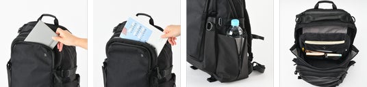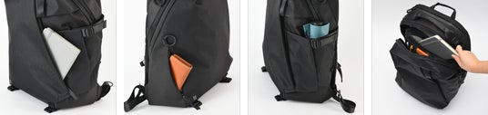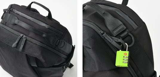 前面やサイド、内装に計13個の多機能ポケットを配置。15インチPCスリーブや、ファスナー引手付近の丸カンによるパドロック(南京錠)対応など、高い収納力とセキュリティ性を兼ね備えています。