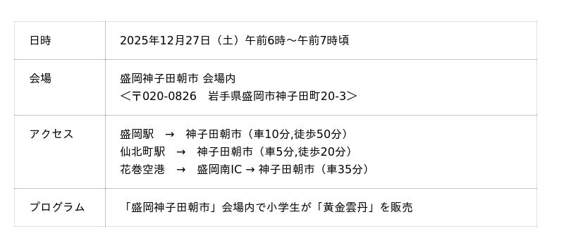 販売会は、2025年12月27日(土)午前6時~午前7時頃に盛岡神子田朝市で行われます。販売会では「いわてマリンツアー2025 in 久慈」に参加した子どもたちも売り場に立ちます。