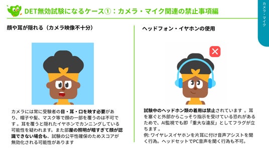 受験者が陥りやすい「無効試験」のケースを、視覚的に分かりやすく解説したオリエンテーション資料。これにより再受験トラブルを未然に防ぎます。