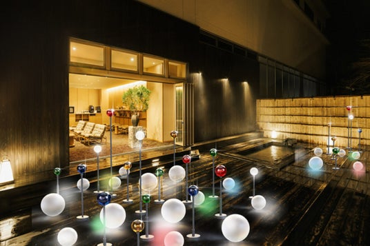 館内の渓流に面した空間、せせらきラウンジの足湯付きのテラスでは、戦国武将・伊達政宗公が身につけたといわれる、水玉模様の陣羽織から着想を得た、冬限定のライトアップを行います。足湯で温まりながらライトアップを鑑賞する優雅な夜のひとときを過ごせます。また、このライトアップを楽しむバータイムとして、地元で蒸留されたウイスキーにドライフルーツや牛タンジャーキーなどをあわせたおつまみの提供も行います。