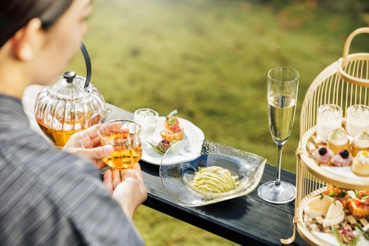 チェックイン前の14:00より、せせらきラウンジにて界 秋保オリジナルの「伊達な茶会アフタヌーンティー」を提供します。他のお客様のいない空間で、ゆったりとしたひとときを過ごせます。アフタヌーンティーには宮城のご当地食材を新感覚で楽しめるよう、セイボリーには仙台麩とクリームチーズのカナッペや笹かまぼことブランダード、スイーツにはずんだのモンブランなどを用意します。また、料理を盛り付けるアフタヌーンティーには、茶の湯の道具である竹を中心にした設えや、三日月の器など伊達政宗公独自の美意識を感じられる雅な演出で提供します。