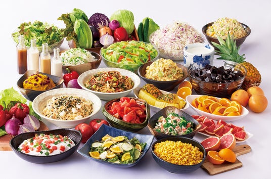 新鮮野菜や惣菜サラダ、フルーツやデザートなど20種類以上が食べ放題の新鮮サラダバーは、産地と鮮度にこだわって仕入れた野菜や果物を使用しています。店内カット、調理をすることで新鮮さと美味しさを保ち、なおかつ栄養も満点です。