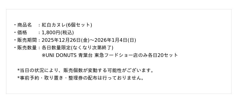 株式会社GRACE(本社:神奈川県横浜市、代表取締役:沢村 優太)が展開するスイーツのテイクアウト専門店『UNI COFFEE ROASTERY BON BON』および生ドーナツ専門店『UNI DONUTS』より、2025年12月26日(金)から2026年1月4日(日)までの期間限定で、新年の幕開けにふさわしい「紅白カヌレ」を発売いたします。