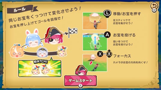 プレイヤーは宝鐘海賊団の「一味」となって、マリン船長が集めた“お宝”=ホロライブ所属タレントたちを転がし、同じお宝同士をくっつけて成長させながら島の頂上を目指します。