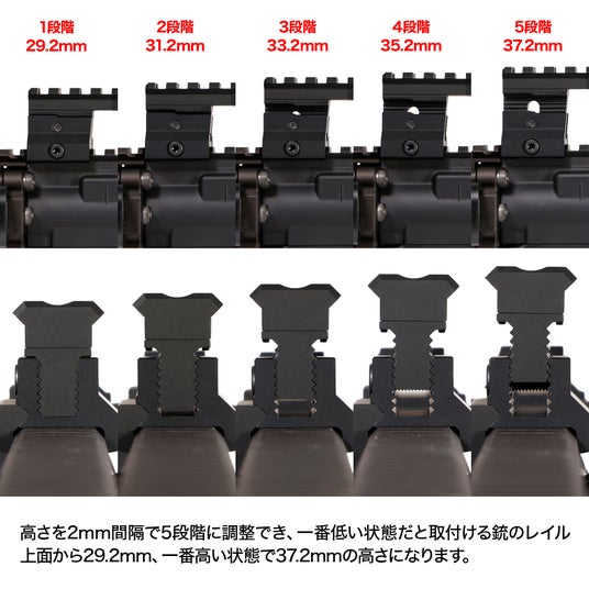 アッパーレシーバー上での視認性向上、光学機器の最適化、外観カスタムの両立を狙うユーザーに向けた多機能ハイマウント。高さは2mm刻みの5段階で調整でき、全長も3パーツ構成で自在に変更可能。近代的なキャリングハンドルの造形を取り入れたデザインは、ミリタリーファンからサバゲー初心者まで幅広い層にフィットします。