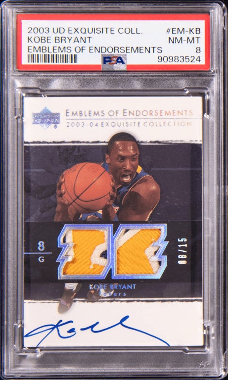 ・アイテム名: 2003-04 Upper Deck Exquisite Collection Emblems of Endorsements #EM-KB Kobe Bryant Signed Game-Used Patch Card (#08/15) - Jersey Number - PSA NM-MT 8 - Pop 1
