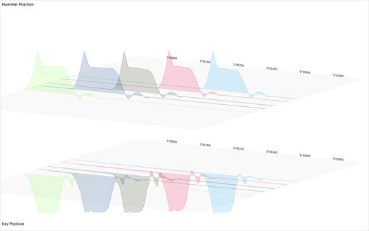 和音を弾いた時のハンマー(上図)と鍵盤(下図)の軌跡データ例