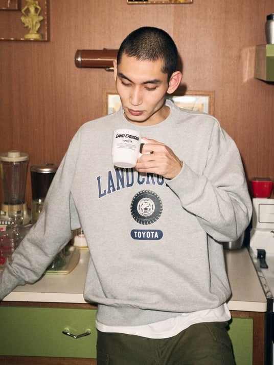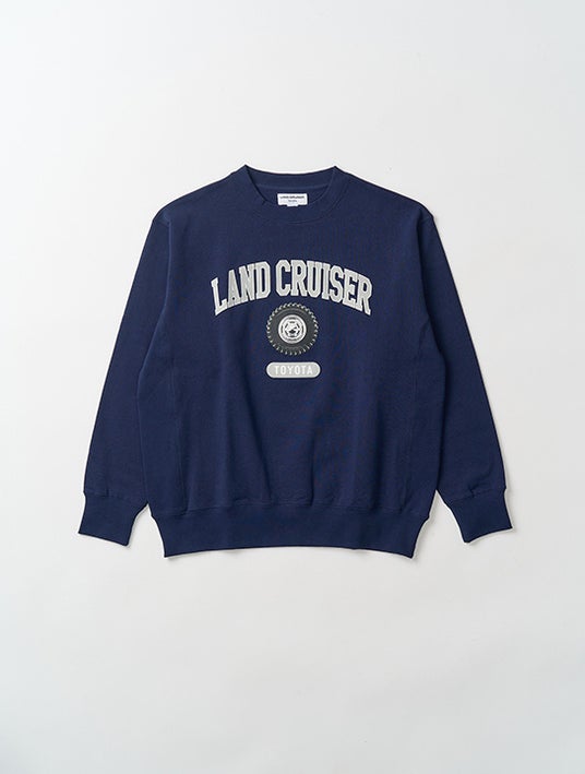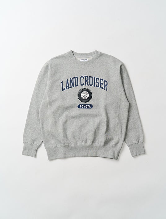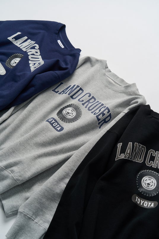 <クラシックなパターンに、カレッジロゴ風にアレンジしたランドクルーザーのシグネチャーホイールを組み合わせた、ヘビーウェイトスウェット>