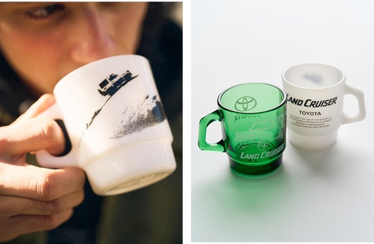 カラーにはFire-Kingを代表する「ミルクホワイト」を採用。形状はスタッキング可能な「スタッキングマグ」をベースに、砂丘(DUNE)を駆け上がるランドクルーザーのイラストをあしらった数量限定デザインです。