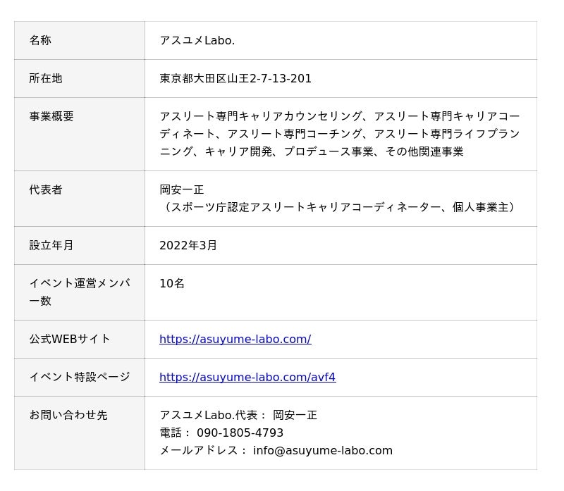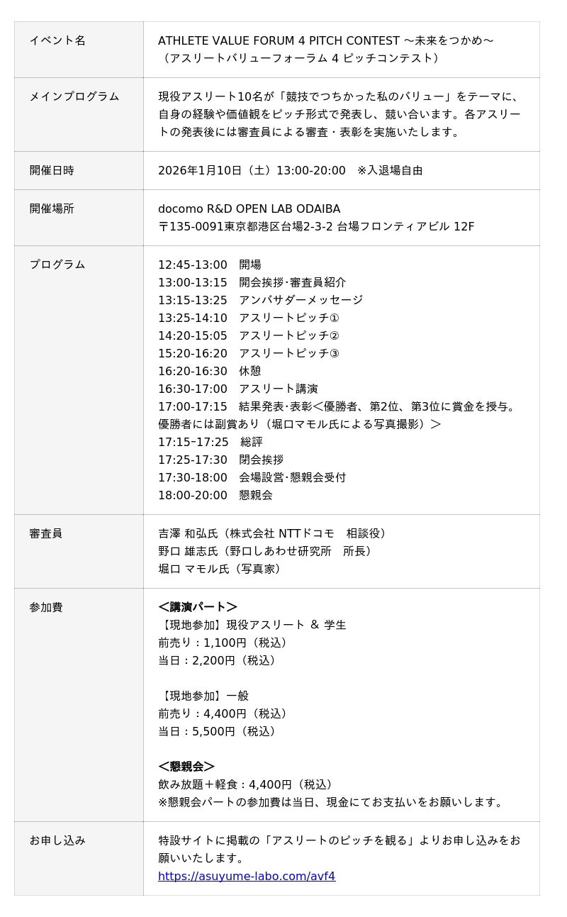 アスユメLabo.(東京都大田区:代表 岡安一正)は、アスリートのキャリア支援を目的としたイベント「ATHLETE VALUE FORUM 4 PITCH CONTEST ~未来をつかめ~」を2026年1月10日(土)、docomo R&D OPEN LAB ODAIBA(東京都港区台場)にて開催いたします。