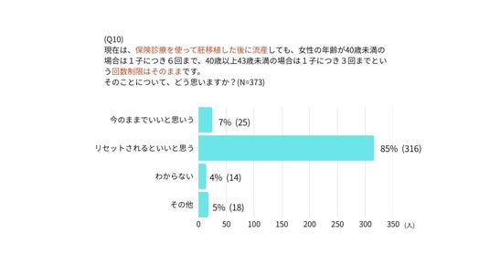 現在、保険診療を使って胚移植した後に流産しても、胚移植の回数制限はそのままです。この状況に対して当事者の85%が「リセットされるとよいと思う」と回答しました。