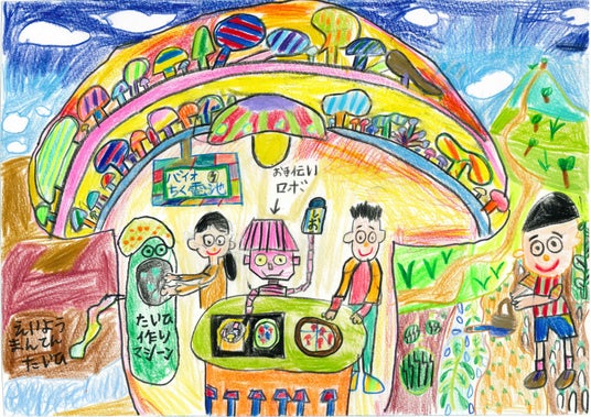 最優秀賞は、脇田良太郎さん(大阪教育大学附属天王寺小学校 3年生)の「KinoKo Kitchen house」。エネルギー循環の仕組みが具体的に示されていることにくわえ、きのこの菌糸体の性質を調べ、高い強度を発揮するという特徴を最大限活かして建物をつくるという着眼点に、審査員の高い評価が集まりました。そのほかにも、描かれているきのこをめくると家族の笑顔あふれるキッチンが現れるしかけ、豊かな色彩感覚で仕上げたイラストであることも評価されました。