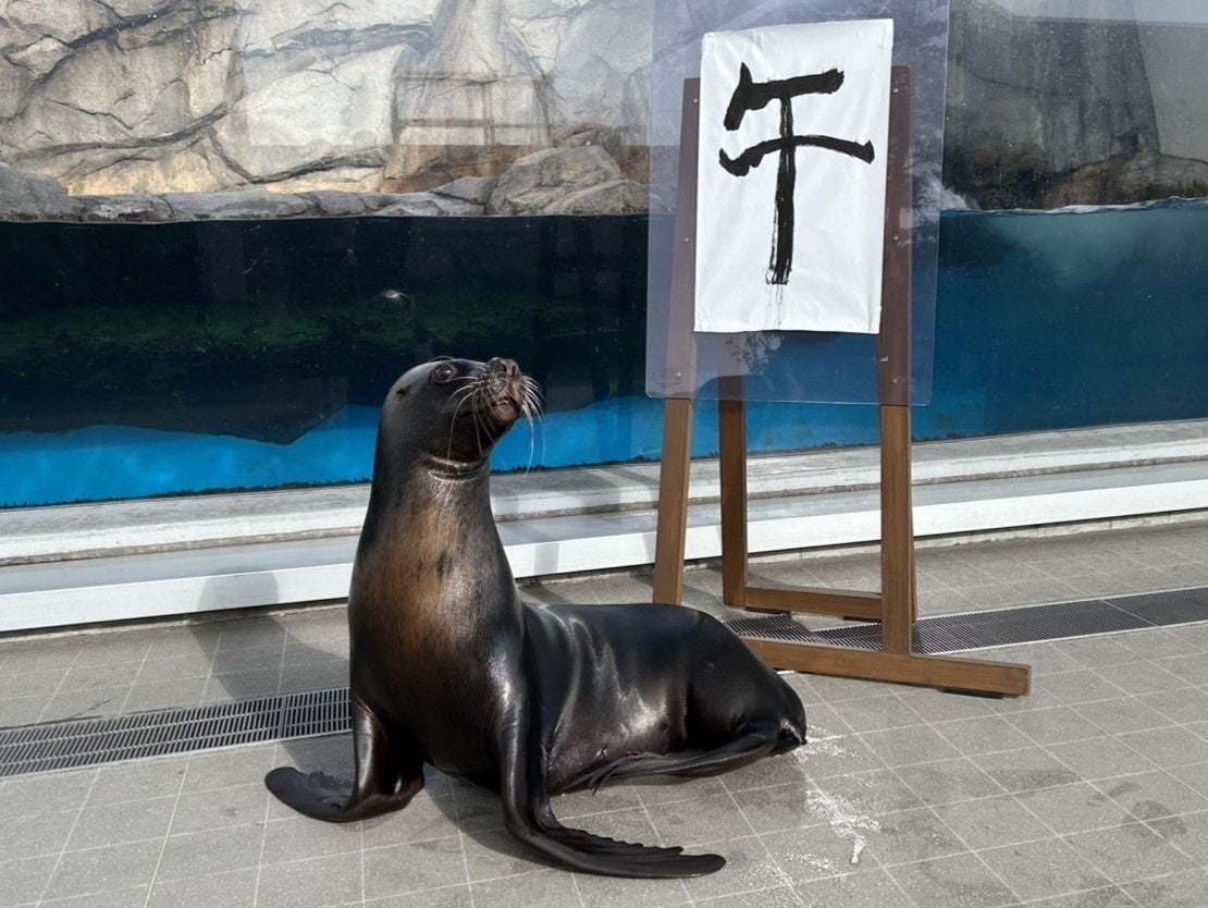 特製の筆を口にくわえ、飼育員と協力して、2026年の干支「午」の文字を書きます。力強い筆づかいで、しなやかな「午」を表現します。